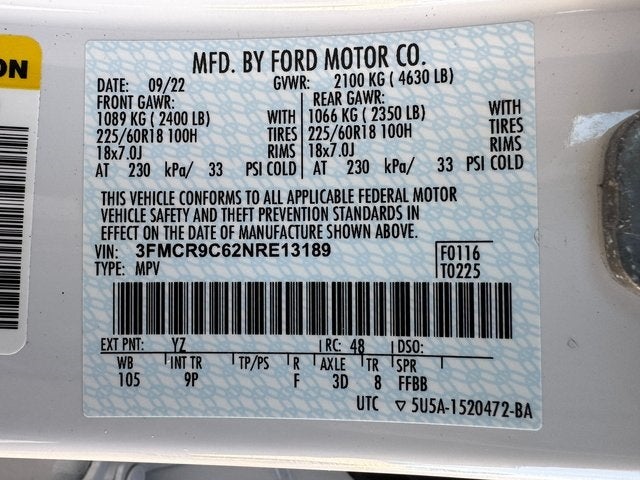 2022 Ford Bronco Sport Oxford White Outer Banks, 4WD**, POWER MOONROOF**, TECH PACKAGE**, CLASS II TRAILER TOW PACKAGE**, APPLE CARPLAY/ANDROID AUTO**, REAR VIEW CAMERA**, HEATED STEERING WHEEL**, HEATED SEATS**, 3.80 Axle Ratio, 4-Wheel Disc Brakes, 4G LTE Wi-Fi Hotspot Credit, 6 Speakers, ABS brakes, Air Conditioning, Alloy wheels, AM/FM radio: SiriusXM, AM/FM Stereo, Auto High-beam Headlights, Auto-dimming Rear-View mirror, Automatic temperature control, Brake assist, Class II Trailer Tow Package w/Trailer Sway Control, Compass, Delay-off headlights, Driver door bin, Driver vanity mirror, Dual front impact airbags, Dual front side impact airbags, Electronic Stability Control, Emergency communication system: SYNC 3 911 Assist, Equipment Group 300A, Four wheel independent suspension, Front & Rear Floor Liners, Front anti-roll bar, Front Bucket Seats, Front Center Armrest, Front dual zone A/C, Front fog lights, Front reading lights, Fully automatic headlights, HD Radio, Heated door mirrors, Heated front seats, Heated steering wheel, Illuminated entry, Knee airbag, Leather Trimmed Heated Sport Contour Bucket Seats, Low tire pressure warning, Occupant sensing airbag, Outside temperature display, Overhead airbag, Overhead console, Panic alarm, Passenger door bin, Passenger vanity mirror, Power door mirrors, Power driver seat, Power Moonroof, Power passenger seat, Power steering, Power windows, Radio data system, Rain sensing wipers, Rear anti-roll bar, Rear Parking Sensors, Rear reading lights, Rear seat center armrest, Rear window defroster, Rear window wiper, Remote keyless entry, Roof rack: rails only, Security system, SiriusXM Radio, Speed control, Speed-sensing steering, Speed-Sensitive Wipers, Split folding rear seat, Steering wheel mounted audio controls, SYNC 3 Communications & Entertainment System, SYNC 3/Apple CarPlay/Android Auto, Tachometer, Tech Package, Telescoping steering wheel, Tilt steering wheel, Traction control, Trip computer, Universal Garage Door Opener (UGDO), Variably intermittent wipers, Wheels: 18 Ebony Black-Painted Aluminum, Wireless Charging Pad. | Tech Pkg. | Moonroof | Tow Pkg. | 4WD CARFAX One-Owner. 4WD 8-Speed Automatic 1.5L EcoBoost