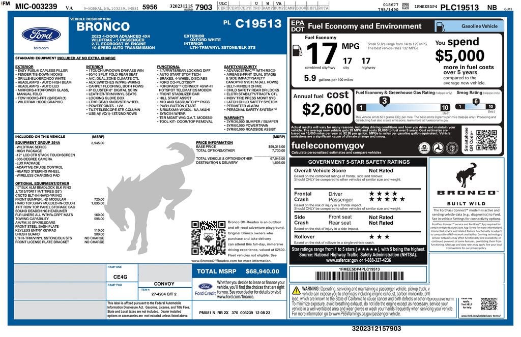 Equipment Group 354A Lux Package (10 Speakers w/Subwoofer, 12 LCD Capacitive Touchscreen w/Swipe Capability, 2 Smart Charging USB Ports In Dashboard, 360-Degree Camera, Adaptive Cruise Control, Additional Sound Deadening, Connected Built-In Navigation, Evasive Steering Assist, Front Parking Sensors, Heated Steering Wheel, Information on Demand Panel, Radio: B&O Sound System by Bang & Olufsen, Sideview Mirrors, Universal Garage Door Opener, and Wireless Charging Pad), ABS brakes, Alloy wheels, Compass, Electronic Stability Control, Front dual zone A/C, Heated door mirrors, Heated front seats, Illuminated entry, Low tire pressure warning, Remote keyless entry, Traction control, 4-Wheel Disc Brakes, 4.7 Axle Ratio, 7 Speakers, Air Conditioning, AM/FM radio: SiriusXM with 360L, AM/FM Stereo, Auto High-beam Headlights, Auto-dimming Rear-View mirror, Automatic temperature control, Brake assist, Connected Navigation, Cruise Control / Speed control, Delay-off headlights, Driver door bin, Driver vanity mirror, Dual front impact airbags, Dual front side impact airbags, Emergency communication system: 911 Assist, Exterior Parking Camera Rear, Front anti-roll bar, Front Bucket Seats, Front Center Armrest, Front fog lights, Front reading lights, Front wheel independent suspension, Fully automatic headlights, Heated Leather-Trimmed/Vinyl Bucket Seats, Integrated roll-over protection, Leather Shift Knob, Navigation system: Connected Navigation, Occupant sensing airbag, Outside temperature display, Overhead airbag, Overhead console, Panic alarm, Passenger door bin, Passenger vanity mirror, Power door mirrors, Power steering, Power windows, Radio data system, Security System, SiriusXM Radio w/360L, Split folding rear seat, Steering wheel mounted audio controls, SYNC 4, Tachometer, Telescoping steering wheel, Tilt steering wheel, Trip computer, Variably intermittent wipers, Voltmeter, and Wheels: 17 Black High Gloss-Painted Aluminum